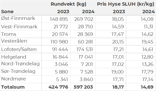 Kvantumet fersklevert hyse i uke 15 var 600 tonn til en verdi av 6,3 millioner kroner. En nedgang fra 725 tonn/ 8,0 millioner kroner uken før. Størst kvantum levert i Øst-Finnmark med 270 tonn av totalen, hvorav 227 tonn tatt med snurrevad. Deretter følger Lofoten/Salten med 174 tonn, hvorav 123 tonn er tatt med garn. I Vesterålen er det levert 60 tonn, hvorav 40 tonn tatt med line/autoline. Vest-Finnmark står for 29 tonn, hvorav 28 tonn er tatt med snurrevad. Deretter følger Troms med 28 tonn, hvorav 21 tonn tatt på snurrevad. Kvantum under 20 tonn i resterende soner.