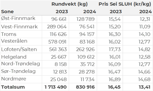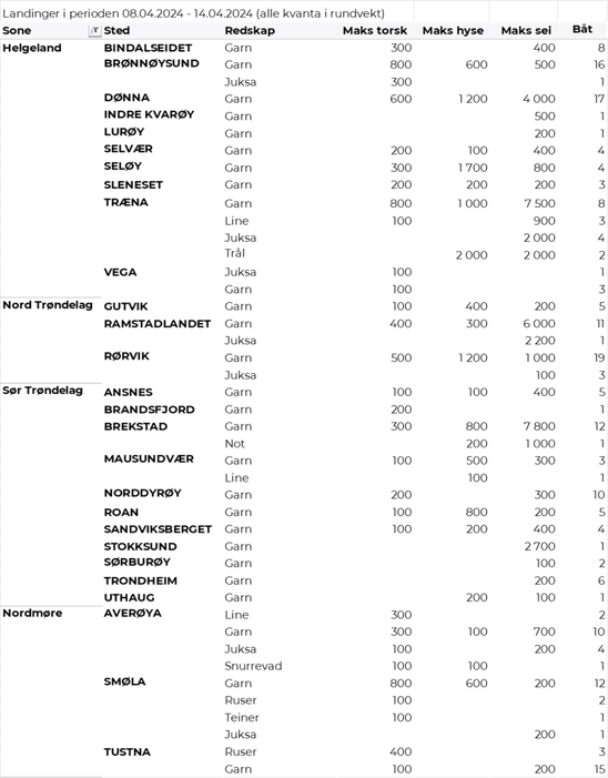 Omsetningen av fersk sei i uke 15 utgjorde 830 tonn til en verdi av 8,3 millioner kroner. En reduksjon fra 1.000 tonn/9,4 millioner kroner uken før. God spredning geografisk, med 260 tonn levert i Lofoten, 130 tonn i Øst-Finnmark, 110 tonn på Helgeland, 80-90 tonn på hver av Vest-Finnmark, Troms, Vesterålen og strekningen Trøndelag-Nordmøre. I hovedsak er kvantumet fisket på snurrevad med 460 tonn og garn med 330 tonn. Ennå ingen seinotfangster levert i Råfisklagets distrikt.