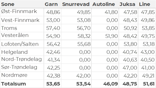 Tabell 2 og 3 viser fordelingen av landingene av fersk torsk pr leveringssone og redskap (unntatt trål), med tilhørende snittpriser. De to tabellene er basert på omsetning av kvalitet A og ekstra, der alle leveringstilstander inngår, men der snittprisene er omregnet til sløyd uten hode-priser, eksklusiv restråstoff.