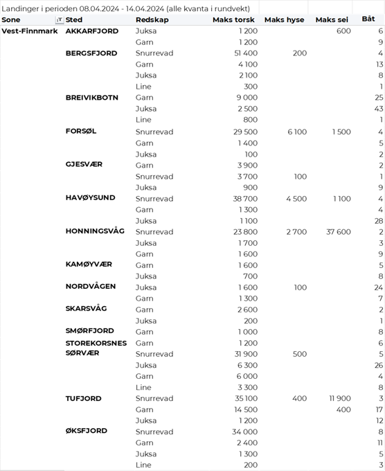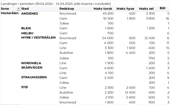 Av kvantumet i uke 15 var 1.820 tonn tatt på snurrevad, 1.480 tonn på garn, 360 tonn på line/autoline og 350 tonn på juksa. Den geografiske fordelingen framgår av tabell 2. Størst kvantum levert Vest-Finnmark, og tar vi med Øst-Finnmark var 2.300 tonn av totalt 4.000 tonn levert i Finnmark. Av 1.580 tonn levert i Vest-Finnmark var 860 tonn tatt på snurrevad, 420 tonn på garn og 270 tonn på juksa. Det er fremdeles mye torsk i området, men fisket sist uke har variert med vær og vind og innslag av lodde og kval/springer. Snurrevad og garn dominerer også i Øst-Finnmark og Troms. I Lofoten var totalt levert 565 tonn, hvorav 340 tonn tatt på garn, 150 tonn på line og 50 tonn på snurrevad. 210 tonn av 380 tonn levert i Vesterålen var snurrevadtorsk, resterende jevnt fordelt på garn og line.