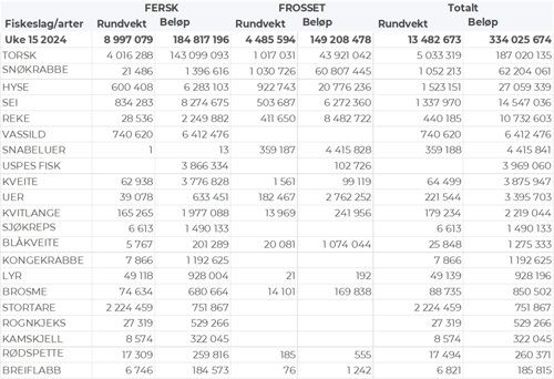 Tabell 1: Omsetning for norske båter i uke 15/2024, fordelt pr fersk/fryst og pr fiskeslag.