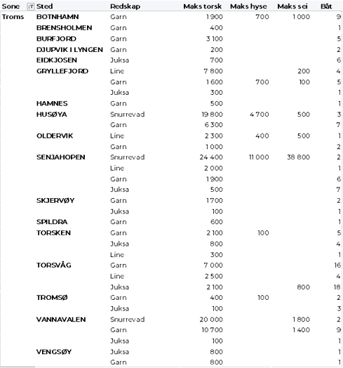 Tabell 2 og 3 viser fordelingen av landingene av fersk torsk per leveringssone og redskap (unntatt trål), med tilhørende snittpriser. De to tabellene er basert på omsetning av kvalitet A og ekstra, der alle leveringstilstander inngår, men der snittprisene er omregnet til sløyd uten hode-priser, eksklusiv restråstoff.