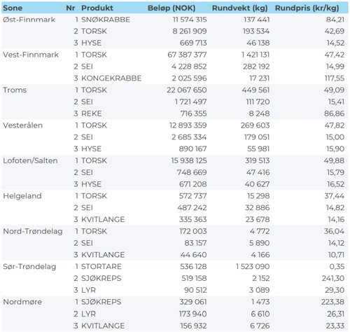 Omsetningen av fersk torsk utgjorde 2.700 tonn til verdi 130 millioner kroner. En reduksjon fra 4.890 tonn/241 millioner kroner uken før. Av totalkvantumet stod garn for 1.390 tonn etterfulgt av snurrevad med 880 tonn, juksa med 290 tonn og line/autoline med 160 tonn. For garn var 760 tonn omsatt til kjøpere i Vest-Finnmark, 240 tonn i Troms, 200 tonn i Lofoten/Salten, 120 tonn i Øst-Finnmark, 25 tonn i Vesterålen og 20 tonn i området Helgeland-Nordmøre. Av snurrevadkvantumet gikk 440 tonn til kjøpere i Vest-Finnmark, 190 tonn i Vesterålen, 160 tonn i Troms, 60 tonn i Lofoten og 20 tonn i Øst-Finnmark. Det meste av juksakvantumet var levert i Vest-Finnmark, mens linekvantumet var spredt med en topp i Lofoten og Vesterålen med 40 tonn på hver.