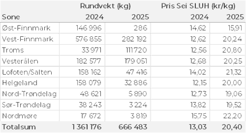 Omsetningen av fersk sei i uke 16 utgjorde 670 tonn til verdi 10 millioner kroner, som var opp fra 510 tonn og 8 millioner kroner i uke 15. Kvanta fersk sei fordelt per leveringssone fremgår av tabell 4. Størst aktivitet i Vest-Finnmark med 280 tonn av totalen, opp fra 100 tonn uka før. Deretter fulgte Vesterålen med 180 tonn, opp fra 130 tonn i uke 15. Av de 280 tonnene levert Vest-Finnmark var 270 tonn tatt på snurrevad. Av 180 tonn levert i Vesterålen var 160 tonn tatt på snurrevad. Av totalen på 670 tonn var 550 tonn tatt på snurrevad og 100 tonn på garn.