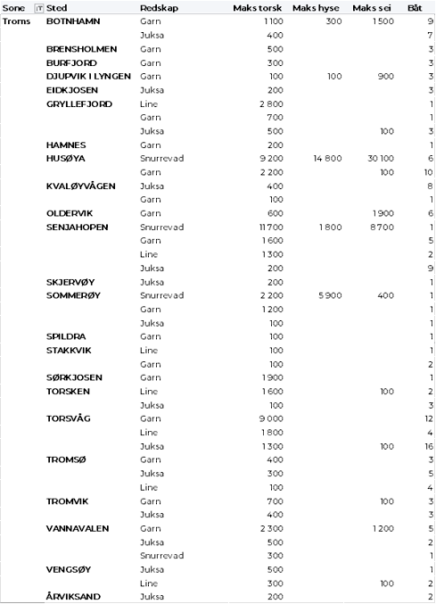 Tabell 2 og 3 viser fordelingen av landingene av fersk torsk per leveringssone og redskap (unntatt trål), med tilhørende snittpriser. De to tabellene er basert på omsetning av kvalitet A og ekstra, der alle leveringstilstander inngår, men der snittprisene er omregnet til sløyd uten hode-priser, eksklusiv restråstoff.