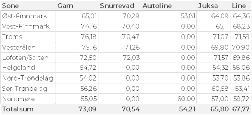 Kvanta fordelt per leveringssone fremgår av tabell 2. Sammenlignet med uke 16 var det reduksjon i landingene over hele linja. Størst kvantum var fremdeles levert i Vest-Finnmark med 1.110 tonn, som var ned fra 1.510 tonn uka før.