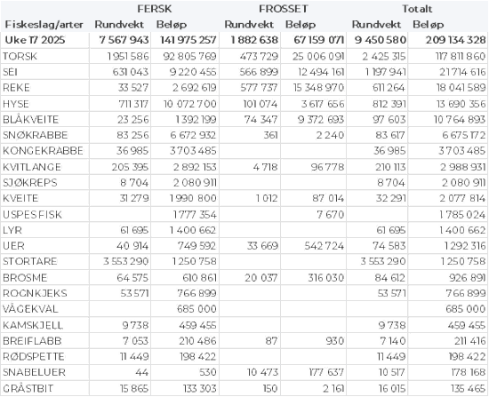 Omsetningen av ferskt råstoff i uke 17 utgjorde 142 millioner kroner, ned fra 167 millioner kroner uka før. Torsken var størst i verdi, fulgt av hyse, sei, snøkrabbe og kongekrabbe til verdi henholdsvis 93, 10, 9, 7 og 4 millioner kroner, og for øvrig slik det framgår av tabell 1.