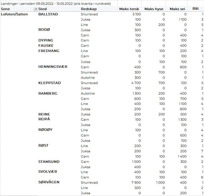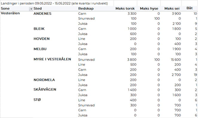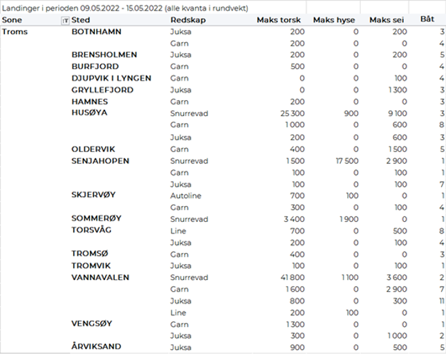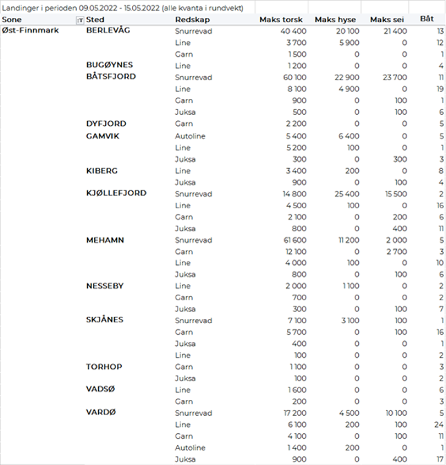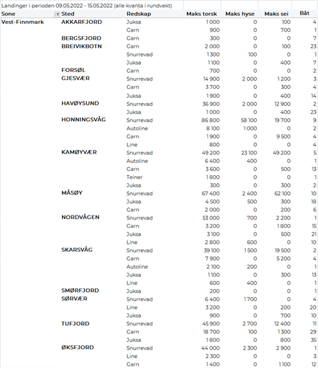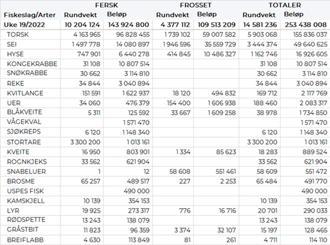 Omsetningen av ferskt råstoff i uke 19 utgjorde 144 millioner kroner, opp fra 135 millioner kroner uken før. Av dette utgjorde torsk 4.160 tonn til verdi 97 millioner. Tilsvarende uke i fjor nådde torskekvantumet 2.940 tonn til verdi 44 millioner kroner. Fordelt per redskap er 2.550 tonn tatt på snurrevad, 800 tonn på garn, 540 tonn på line/autoline og 275 tonn på juksa. Størst snurrevadkvantum er levert i Vest-Finnmark med 1.730 tonn, fulgt av Øst-Finnmark med 670 tonn og Troms med 100 tonn. Av garnkvantumet var 580 tonn levert i Vest-Finnmark, 150 tonn i Øst-Finnmark, og for øvrig labert. 400 tonn av linetorsken var levert i Øst-Finnmark, 150 tonn i Vest-Finnmark og for øvrig labert. Av de 275 tonnene med juksatorsk var 210 tonn levert i Vest-Finnmark og 35 tonn i Øst-Finnmark.