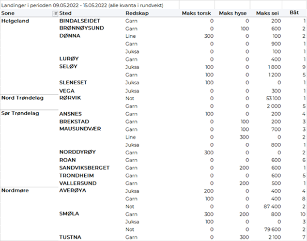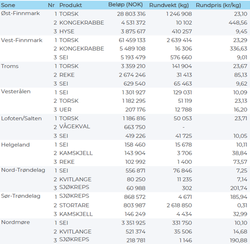 Den geografiske fordelingen av fersklevert torsk viser at Vest-Finnmark er største sone i forrige uke med vel 2.600 tonn, der altså 1.730 tonn var tatt på snurrevad, 580 tonn på garn, 210 tonn på juksa og 110 tonn på lina. Deretter fulgte Øst-Finnmark med 1.270 tonn, der 670 tonn var tatt på snurrevad, 410 tonn på lina, 150 tonn på garn, og 35 tonn på juksa.