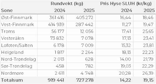 Kvantumet fersklevert hyse i uke 20 var 750 tonn til verdi 10 millioner kroner. Det var ned fra 1.160 tonn/16 millioner kroner uken før. Tabell 5 viser sonevis fordeling av kvanta. Finnmark topper med totalt 710 tonn, fordelt med 410 tonn i Øst- og 300 tonn i Vest-Finnmark. 610 tonn av totalen var tatt på snurrevad, 100 tonn på line/autoline.