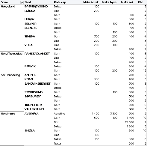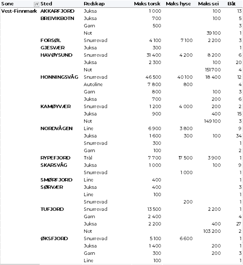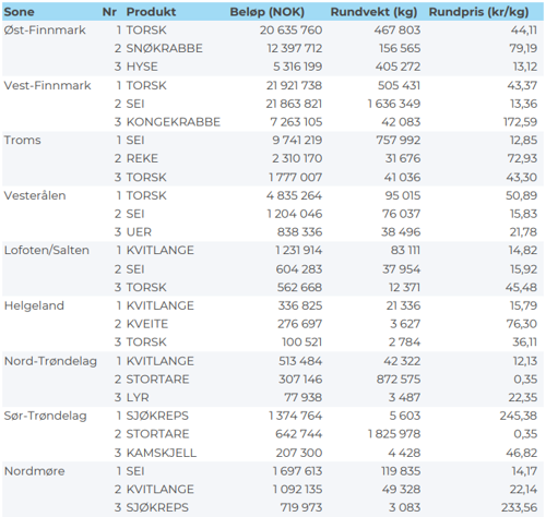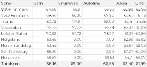 Kvanta fordelt per leveringssone fremgår av tabell 2. Det var bare Øst-Finnmark som holdt samme nivå som uka før, ellers var det reduksjon for øvrige områder. Størst kvantum var fremdeles levert i Vest-Finnmark med vel 500 tonn, som var ned fra 600 tonn uka før.