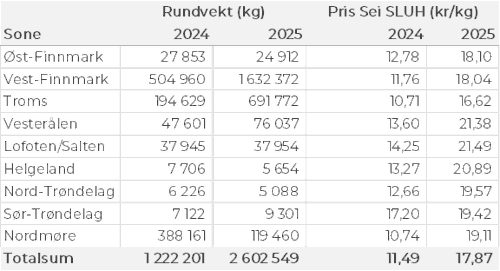 Omsetningen av fersk sei økte kraftig og utgjorde 2.670 tonn til verdi 36 millioner kroner, opp fra 1.660 tonn og 24 millioner kroner i uke 19. Kvanta fersk sei fordelt per leveringssone fremgår av tabell 4. Størst aktivitet i Vest-Finnmark og Troms med henholdsvis 1.640 og 760 tonn. Av totalen på 2.670 tonn var 2.330 tonn tatt på not, 130 tonn på garn, 90 tonn på snurrevad, 70 tonn på trål og 50 tonn på juksa. Det var 12 båter som leverte notsei til 4 kjøpere i Vest-Finnmark, 3 kjøpere i Troms og en kjøper på Nordmøre. Flere felt på Lopphavet stengt av Fiskeridirektoratet i løpet av uka som følge av for stor innblanding av sei under minstemålet.