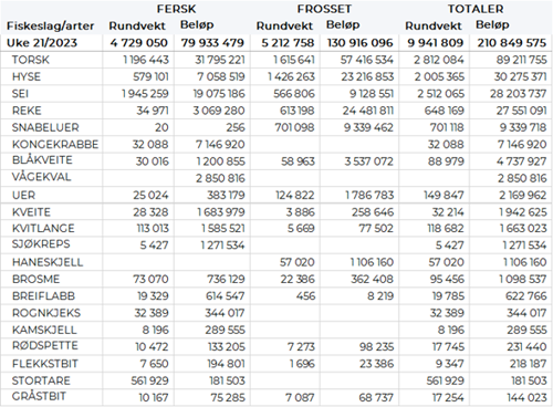 Råfisklagets omsetning i uke 21 er på 277 millioner kroner (foreløpig tall), som er opp fra 190 millioner kroner uka før. I tallet for uke 21 inngår 66 millioner kroner etter utenlandske leveranser. Omsetningen for norske båter stod for 211 millioner kroner, fordelt med 80 millioner kroner på fersk og 131 millioner kroner på fryst råstoff.