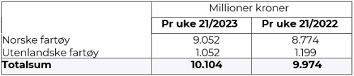 Tilsvarende for uke 21 i fjor var omsetningen 384 millioner kroner, hvorav utenlandske leveranser utgjorde 85 millioner kroner. Omsetningen for norske båter på 298 millioner kroner var fordelt med 163 på fersk og 135 på fryst råstoff.