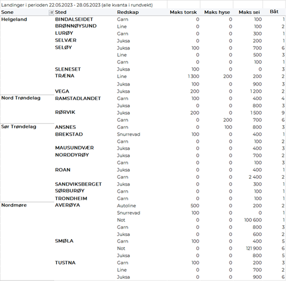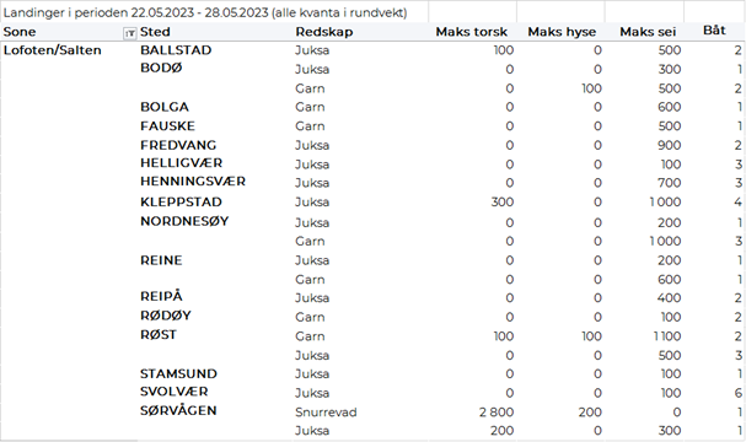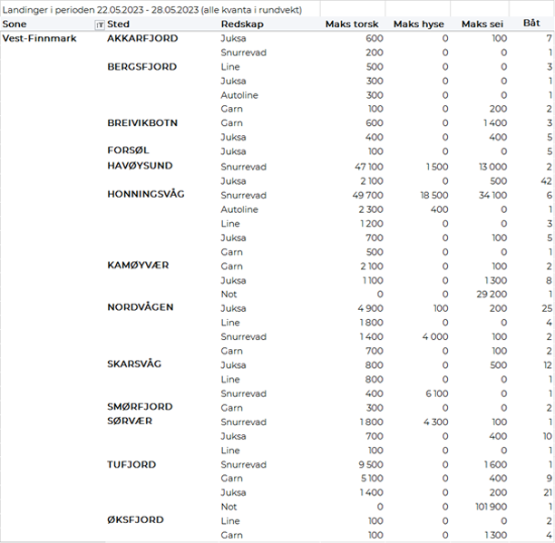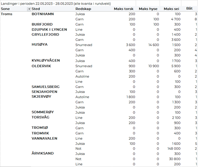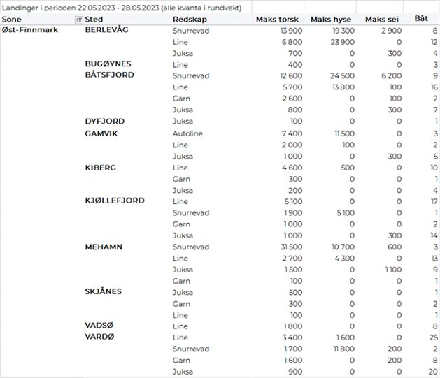 Omsetningen av fersk torsk, alle kvaliteter og tilstander, i uke 21 utgjorde 1.200 tonn til verdi 32 millioner kroner, som er ned fra 1.810 tonn og 48 millioner kroner uka før. Fordelt per redskap i uke 21 viser tallene 560 tonn tatt på snurrevad, 360 tonn på line/autoline, 200 tonn på juksa, og 70 tonn på garn. Det har ikke vært trållandinger med fersk torsk de 11 siste ukene. Geografisk var størst kvantum omsatt i Finnmark med totalt 1.110 tonn, fordelt med 650 tonn i Øst- og 460 tonn i Vest-Finnmark, labert i andre områder. Av snurrevadkvantumet var 240 tonn levert Øst-Finnmark, 260 tonn i Vest-Finnmark og 50 tonn i Vesterålen. Det meste av linekvantumet, nærmere bestemt 330 tonn, var levert i Øst-Finnmark. Juksakvantumet var i hovedsak levert i Vest-Finnmark med 140 tonn, fulgt av Øst-Finnmark med 60 tonn. Garnkvantumet var fordelt med 20 tonn i Øst-Finnmark og 40 tonn i Vest-Finnmark.