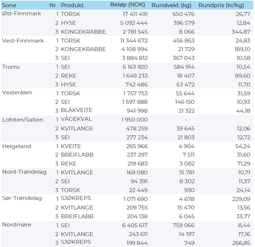 Omsetningen av ferskt råstoff i uke 21 ble 80 millioner kroner, ned fra 87 millioner kroner uka før. Torsk, sei, hyse og kongekrabbe var størst i verdi med henholdsvis 32, 19, 7 og 6 millioner kroner, og for øvrig slik det framgår av tabell 2.