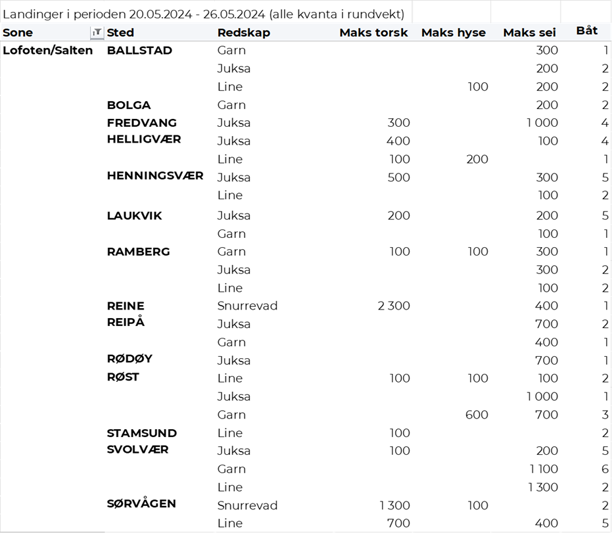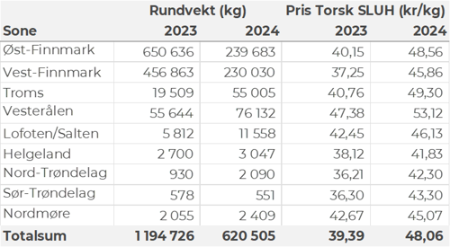 Omsetningen av fersk torsk i uke 21 utgjorde 620 tonn til en verdi av 20 millioner kroner, en reduksjon fra 840 tonn/27 millioner kroner uken før. Toppuken så langt i år er uke 10 med 12.730 tonn og 459 millioner kroner. Det er imidlertid enda et stykke igjen til de kvantumsnivåene som toppukene i vinterfisket har pleid å ligge på. I 2021 inntraff toppuka i uke 10 med 22.333 tonn/ 356 millioner kroner omsatt. Uke 10 var også toppuken i 2022 da det ble omsatt 18.042 tonn/ 447 millioner kroner. I 2023 inntraff toppuken i uke 12 da det var omsatt 19.545 tonn/ 627 millioner kroner. Tradisjonelt sett har toppukene i vinterfisket pleid å være i uke 10-12.