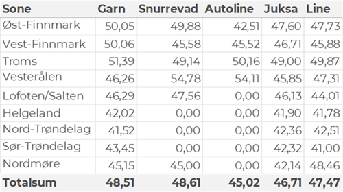 Tabell 2 og 3 viser fordelingen av landingene av fersk torsk pr leveringssone og redskap (unntatt trål), med tilhørende snittpriser. De to tabellene er basert på omsetning av kvalitet A og ekstra, der alle leveringstilstander inngår, men der snittprisene er omregnet til sløyd uten hode-priser, eksklusiv restråstoff.