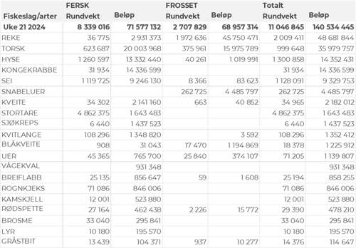 Foreløpige tall for norske båter i perioden viser 69 millioner kroner, ned fra 79 millioner kroner i uke 20. Omsetningen i uke 21 bestod i hovedsak av 1.970 tonn reke, 375 tonn torsk og 260 tonn snabeluer verdt henholdsvis 46, 16 og 4 millioner kroner.