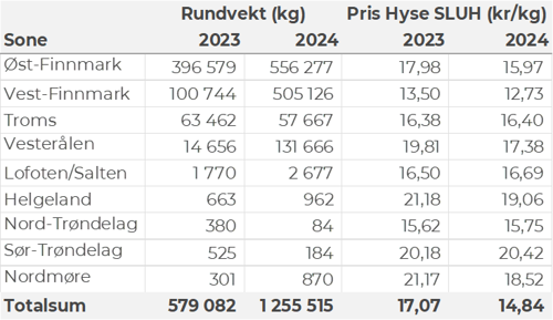 Kvantumet fersklevert hyse i uke 21 var 1.260 tonn til en verdi av 13,3 millioner kroner. Mot 920 tonn/9,3 millioner kroner uken før. 1.030 tonn var tatt på snurrevad og 225 tonn på line/autoline. Flere områder fra Magerøya og østover er stengt for fiske med snurrevad som følge av stor innblanding av undermålfisk. Størst kvantum levert i Øst-Finnmark med 560 tonn av totalen, jf. tabell 5, der 380 tonn var tatt på snurrevad og 175 tonn på line/autoline. Deretter følger Vest-Finnmark med 510 tonn der så og si alt var tatt på snurrevad. Vesterålen fulgte så med 130 tonn, og Troms med vel 50 tonn, også der stod snurrevad for det meste av landingene.