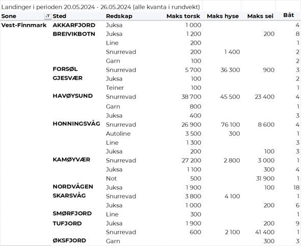 Av kvantumet i uke 21 var 380 tonn tatt på snurrevad, 140 tonn på line/autoline, 70 tonn på juksa og 30 tonn på garn. Den geografiske fordelingen av landingene framgår av tabell 2. Størst kvantum levert Øst-Finnmark, med Vest-Finnmark like bak. 470 tonn av totalt 620 tonn levert i Finnmark. Av 240 tonn levert i Øst-Finnmark var 115 tonn tatt på line/autoline og 100 tonn på snurrevad. Omsetningen til kjøpere i Vest-Finnmark var totalt 230 tonn, fordelt med 170 tonn på snurrevad og 50 tonn på juksa. Beskjedne leveranser fersk torsk sør for Finnmark.