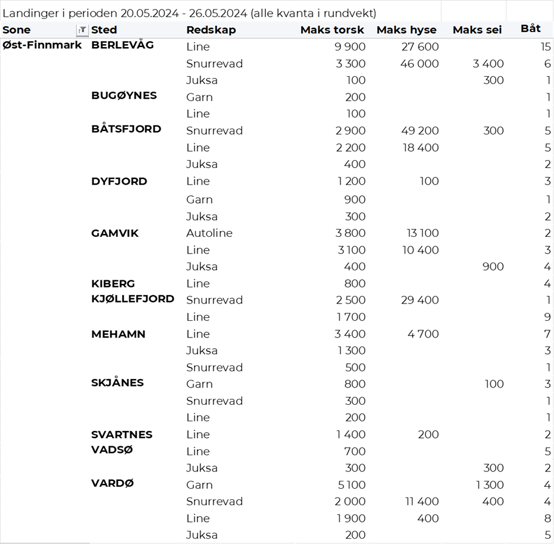 I løpet av uke 21 ble det levert 37 tonn fersk reker til en verdi av 2,9 millioner kroner. En tangering av uken før når det var omsatt 37 tonn/ 2,9 millioner kroner. Størst kvantum fisket på Varangerfjorden med 20 tonn, 6,5 tonn i Kvænangen, 3,4 tonn i Porsangerfjorden og kvanta fra 1,7 tonn og lavere i resterende fangstfelt.