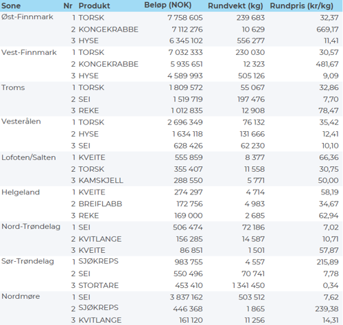 Omsetningen av ferskt råstoff i uke 21 utgjorde 72 millioner kroner, ned fra 75 millioner kroner uken før. Torsk, kongekrabbe, hyse og sei var størst i verdi med henholdsvis 20, 14, 13 og 9 millioner kroner og for øvrig slik det framgår av tabell 1.