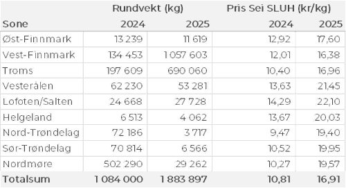 Omsetningen av fersk sei utgjorde 2.020 tonn til verdi 26 millioner kroner, ned fra en foreløpig topp for året på 2.670 tonn og 36 millioner kroner i uke 20. Kvanta fersk sei fordelt per leveringssone fremgår av tabell 4. Størst aktivitet i Vest-Finnmark og Troms med henholdsvis 1.060 og 830 tonn. Av totalen på 2.020 tonn var 1.620 tonn tatt på not, 130 tonn på trål og tilsvarende på snurrevad, 90 tonn på garn og 40 tonn på juksa. Det var 13 båter som leverte notsei, en på Nordmøre og resten i Vest-Finnmark og Nord-Troms.