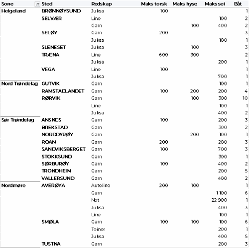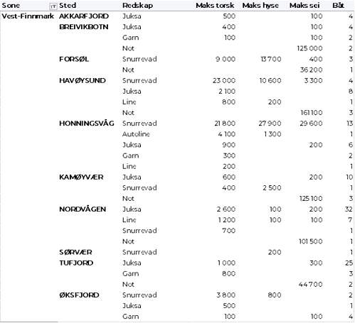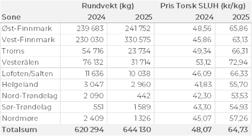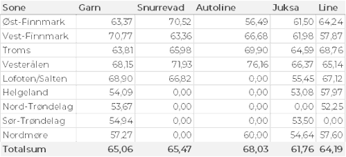 Kvanta fordelt per leveringssone fremgår av tabell 2. Størst kvantum var fremdeles levert i Vest-Finnmark med 330 tonn, som var ned fra 500 tonn uka før.