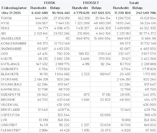 Omsetningen av ferskt råstoff i uke 21 utgjorde 96 millioner kroner, ned fra 142 millioner kroner uka før. Torsken var størst i verdi, fulgt av sei, kongekrabbe, hyse, snøkrabbe og reke til verdi henholdsvis 28, 26, 13, 8, 4 og 4 millioner kroner, og for øvrig slik det framgår av tabell 1.