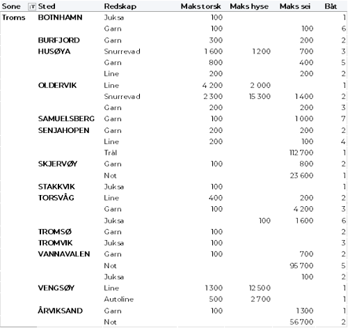 Tabell 2 og 3 viser fordelingen av landingene av fersk torsk per leveringssone og redskap (unntatt trål), med tilhørende snittpriser. De to tabellene er basert på omsetning av kvalitet A og ekstra, der alle leveringstilstander inngår, men der snittprisene er omregnet til sløyd uten hode-priser, eksklusiv restråstoff.
