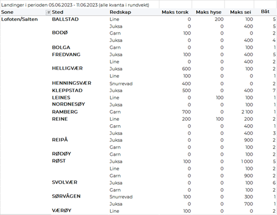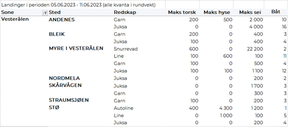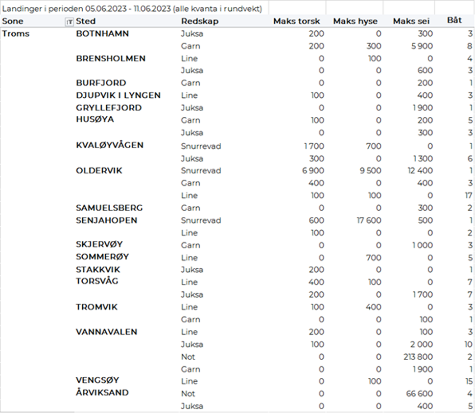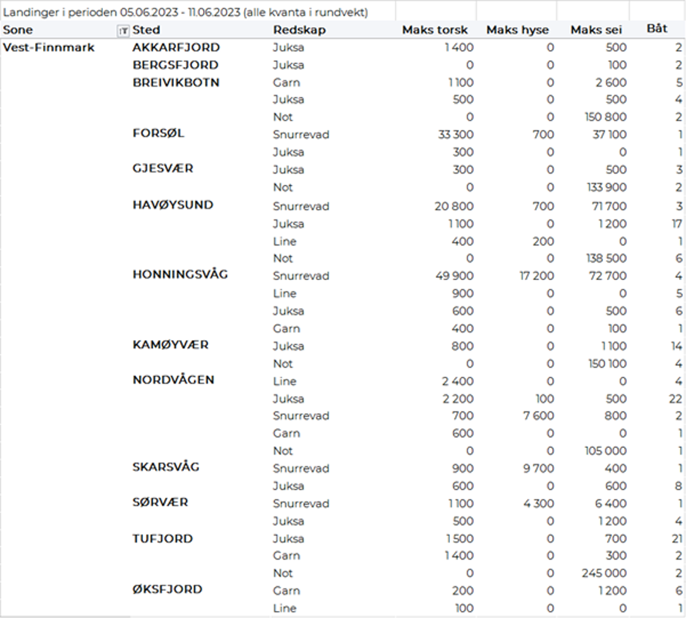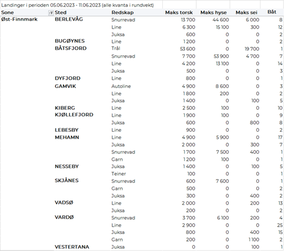 Omsetningen av fersk torsk i uke 23 utgjorde 930 tonn til verdi 24 millioner kroner, som var ned fra 1.400 tonn og 37 millioner kroner sammenlignet med uka før. 440 tonn var tatt på snurrevad, 265 tonn på lina, 150 tonn på juksa og 50 tonn på trål. 540 tonn omsatt til kjøpere i Øst-Finnmark og 350 tonn i Vest-Finnmark, ellers labert. Størst snurrevad- og juksakvantum levert i Vest-Finnmark, mens lina stod nær halvparten av kvantumet levert i Øst-Finnmark hvor også trålkvantumet var levert.