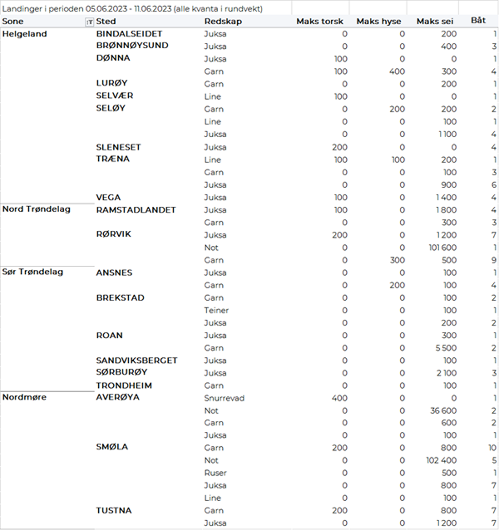 Omsetningen av fersk sei i uke 23 utgjorde hele 4.800 tonn til verdi 48 millioner kroner, som var mer enn en dobling sammenlignet med uka før. Størst kvantum var levert i Vest-Finnmark med 2.880 tonn, fulgt av Troms med 830 tonn, Nordmøre med 640 tonn, Nord-Trøndelag med 230 tonn, Vesterålen med 110 tonn, ellers labert. Fordelt per redskap er not størst med hele 3.890 tonn, fulgt av snurrevad med 560 tonn, videre 200 tonn på juksa og 110 tonn på garn. 15 notbåter hadde leveranser i nord, med 2.320 tonn til 6 kjøpere i Vest-Finnmark og 740 tonn til 2 kjøpere i Troms. I tillegg var det leveranser fra 6 notbåter til 2 kjøpere på Nordmøre med totalt 620 tonn, og fra en båt til en kjøper i Nord-Trøndelag med 220 tonn. Også snurrevadseien var i hovedsak levert i Vest-Finnmark, mens juksafisket var mer spredt.