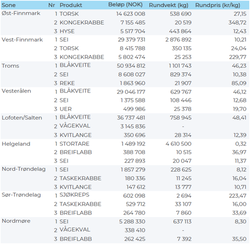 I løpet av uke 23 ble det levert 52 tonn kongekrabbe til en verdi av 13,7 millioner kroner. En økning fra 40 tonn/ 10,1 millioner kroner uken før. Av totalen er 33 tonn tatt av 102 båter i det kvoteregulerte fisket, videre er 19 tonn tatt i det uregulerte fisket av 32 båter. For all fangst av kongekrabbe fordeler fangsten seg geografisk med 10 tonn fanget i havområder rundt Gjesvær, 9 tonn i Porsangerfjorden, 8 tonn i havområdet rundt Fruholmen, 6 tonn i Laksefjorden og 7 tonn i Varangerfjorden. Kvanta under 3 tonn i resterende områder.
