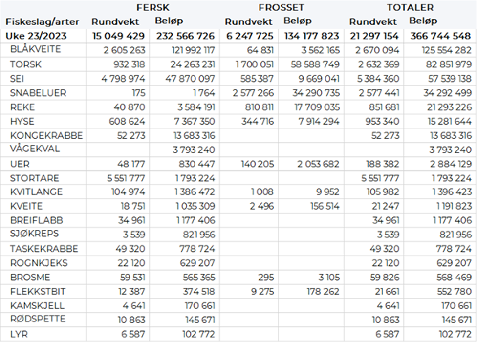 Omsetningen av ferskt råstoff i uke 23 ble 233 millioner kroner, opp fra 156 millioner kroner uka før. Direktefisket etter blåkveite for båter under 28 meter største lengde som drifter med konvensjonelle redskaper, kom i gang mandag 29. mai, og stod for en stor andel av ferskomsetninga. Omsetningen av fersk blåkveite kom opp i 2.600 tonn til verdi 122 millioner kroner, som var nær det doble av uka før. Sei, torsk, kongekrabbe og hyse fulgte deretter i verdi med henholdsvis 48, 24, 14 og 7 millioner kroner, og for øvrig slik det framgår av tabell 2.