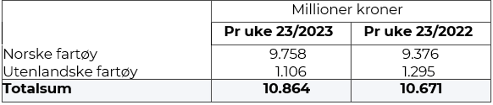 Tilsvarende for uke 23 i fjor var omsetningen 317 millioner kroner, hvorav utenlandske leveranser utgjorde 43 millioner kroner. Omsetningen for norske båter på 274 millioner kroner var fordelt med 131 på fersk og 143 på fryst råstoff.