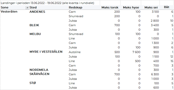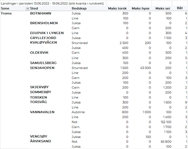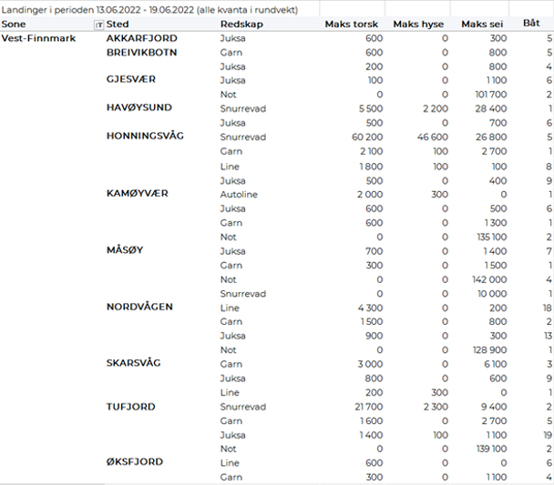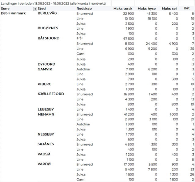 Omsetningen av fersk torsk ble redusert til 1.470 tonn og verdi 34 millioner i uke 23, fra 1.590 tonn og 37 millioner kroner uka før. I uke 24 i fjor nådde torskekvantumet 1.500 tonn til verdi 24 millioner kroner. Fordelt per redskap er 680 tonn tatt på snurrevad, 500 tonn på line/autoline, 150 tonn på juksa, 90 tonn på trål og 50 tonn på garn. Størst snurrevadkvantum er levert i Øst-Finnmark med 390 tonn og Vest-Finnmark med 275 tonn. 425 tonn av linetorsken var levert i Øst-Finnmark og 60 tonn i Vest-Finnmark. Av juksakvantumet var jevnt fordelt på Øst- og Vest-Finnmark med 70 tonn på hver. Av de 50 tonnene med garntorsk var 30 tonn levert i Vest-Finnmark.
