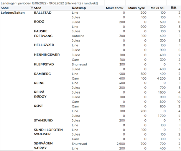 Råfisklagets omsetning i uke 24 er på 265 millioner kroner (foreløpige tall), ned fra 311 millioner kroner uka før. I tallet for uke 24 inngår 52 millioner kroner etter landing fra utenlandske båter, i hovedsak 2.440 tonn torsk fra 6 russiske frysetrålere. Omsetningen for norske båter stod dermed for 213 millioner kroner, fordelt med 132 millioner kroner på fersk og 80 millioner kroner på fryst råstoff.