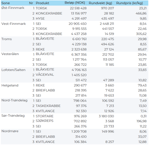 Det foregår et sesongfiske etter et mangfold av arter på denne tiden av året. Noen av de er sei med not, rognkjeks, blåkveite, kongekrabbe. Også forrige uke var det fersk sei som det ble levert størst mengde av, 3,5 millioner kilo til en verdi av vel 30 millioner kroner. I kystflåtens direktefiske etter blåkveite, gjenstår det kun 350 tonn av årets første periode, og en stopp i fisket er nært forestående. Leveranser av både kongekrabbe og kystreke økte i forrige uke, helt i takt med sesongen.