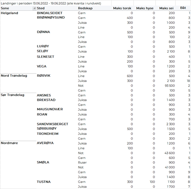 Omsetningen av fersk sei i uke 24 utgjorde 3.520 tonn/30 millioner kroner, ned fra 3.940 tonn/33,2 millioner kroner uken før. Det var størst aktivitet i Vest-Finnmark hvor det ble levert 2.450 tonn, hvorav 2.190 tonn på not og 150 tonn var fra snurrevad. Øst-Finnmark blir liten i sammenligning med 60 tonn, hvorav 36 tonn fra snurrevad. Deretter fulgte Troms med 490 tonn, hvorav 460 tonn fra not. I Vesterålen var det levert 120 tonn, herav 60 tonn på garn og 50 tonn på juksa. 47 tonn levert i Lofoten. Videre var det levert 150 tonn i Nord-Trøndelag, hvorav 140 tonn kom fra not. På Nordmøre var det levert 150 tonn, hvorav 120 tonn kom fra not. Mindre kvanta i resterende soner.