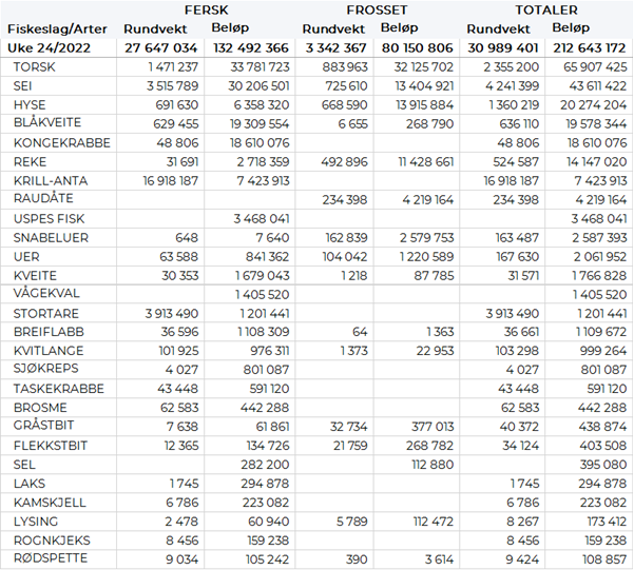 I uke 24 ble det fisket 49 tonn kongekrabbe til en verdi av 18,6 millioner kroner, opp fra 34 tonn/ 12,6 millioner kroner. Av dette ble 36,5 tonn fanget i det regulerte fisket av 109 båter. 12 tonn ble tatt i det uregulerte fisket av 55 båter. Gjennomsnittsprisen for A-kvalitets hannkrabbe fra det regulerte fisket ble betalt med i snitt 485 kr/kg, opp fra 478 kr/kg uken før. Fordelt per fangstfelt for all fangst av kongekrabbe er fordelingen følgende: 10 tonn i Laksefjorden, 10 tonn i havområdet utenfor Gjesvær, 9 tonn i havområdet mellom Berlevåg og Båtsfjorden, 8 tonn i Varangerfjorden, 5 tonn i Porsangerfjorden, 4 tonn i Tanafjorden og kvanta under 3 tonn i resterende fangstfelt.