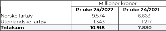 Totalomsetningen hittil i år sammenlignet med tilsvarende periode i fjor framgår av tabell 1. Den økte omsetningen for norske båter er på vel 2,9 milliarder kroner, fordelt med pluss på 1,95 på fersk- og 0,96 på frystomsetningen. Frystomsetningen pr uke 24 i år er på 3.616 millioner kroner, mens ferskomsetningen er oppe i 5.958 millioner kroner. En stor del av den økte frystomsetningen skriver seg fra sluttspurten i 2021 der kvantumet er omsatt på begynnelsen av 2022. Men økt omsetning av fryst råstoff også i uke 6, da foreløpig ukerekord ble satt med 275 millioner kroner, en rekord som ble slått i uke 12 da med 290 millioner kroner. Omsetningen av fryst torsk pr uke 24 i år er 1.755 millioner kroner mot 1.107 millioner kroner til samme tid i fjor, av kvantum på henholdsvis 58.100 og 54.100 tonn. Når det gjelder omsetningen av fersklevert råstoff, drar torsken opp pga. økte priser til tross for redusert kvantum. Kvantum fersk torsk omsatt så langt er 182.400 tonn, mot 188.200 tonn til samme tid i fjor, mens verdien er opp fra 3.023 til 4.464 millioner kroner.