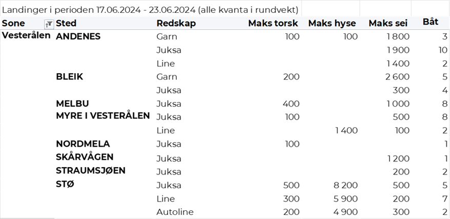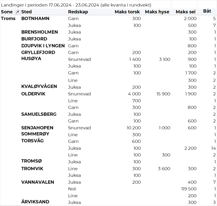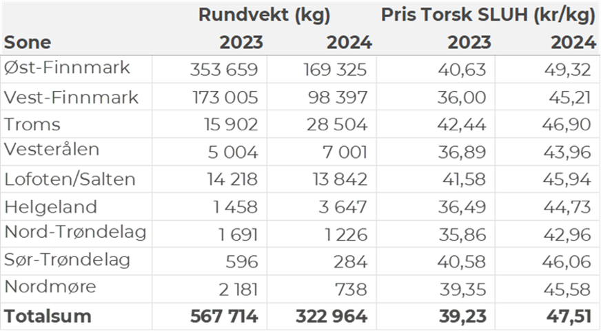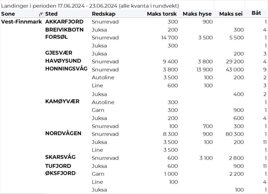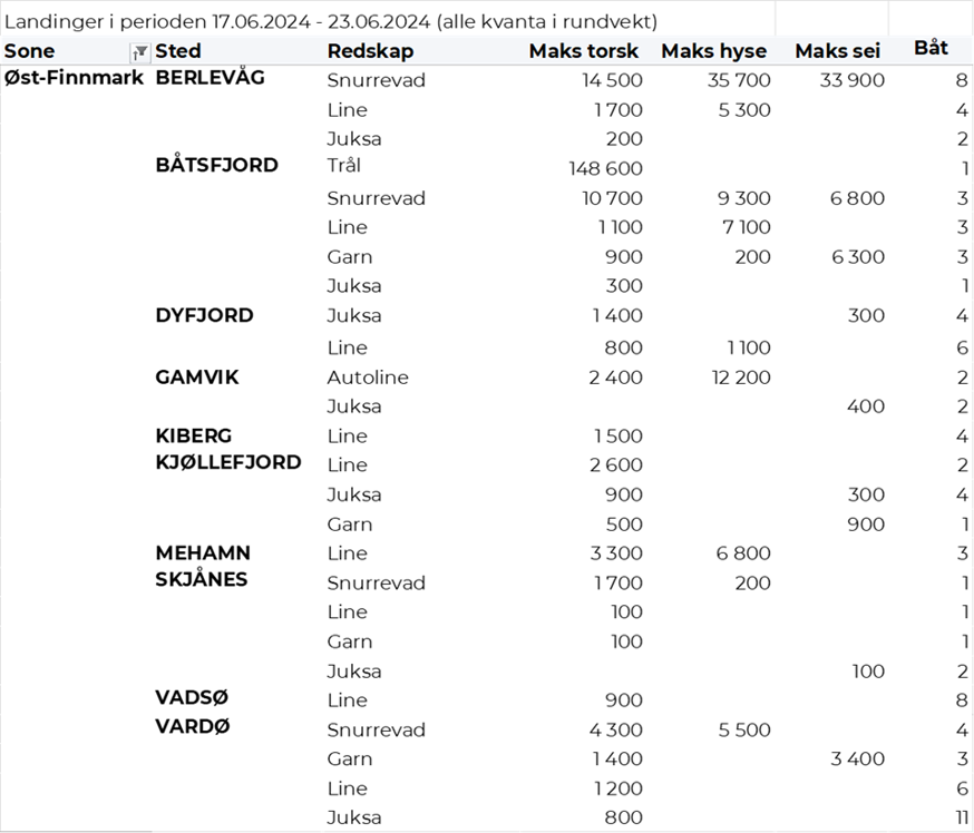 Omsetningen av fersk torsk i uke 25 utgjorde 472 tonn til verdi 15 millioner kroner. En nedgang fra 537 tonn/ 17,4 millioner kroner uken før. Mest levert til Øst-Finnmark som står for 318 tonn av totalen. Etterfulgt av Vest-Finnmark med 99 tonn og 28 tonn i Troms. Kvanta fra 14 tonn og lavere per leveringssone for resterende. Fordelt på redskap er 197 tonn tatt med snurrevad, der det meste er levert til Berlevåg og Båtsfjorden. Videre er det tatt 149 tonn med trål, alt levert Båtsfjorden. På line/autoline er det tatt 70 tonn, med fangster mer jevnt fordelt per sted og der Gamvik er har mest leveranser med 7 tonn. Det tas også noen juksafangster og det er på redskapstypen landet totalt 37 tonn, hvorav 8 tonn er levert i Nordvågen.