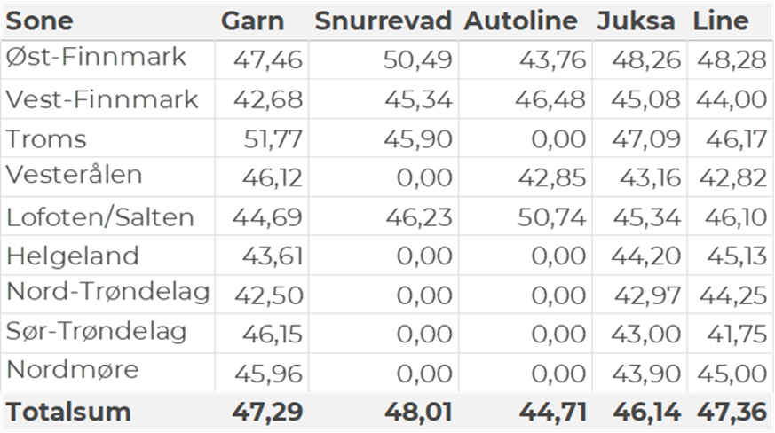Tabell 2 og 3 viser fordelingen av landingene av fersk torsk pr leveringssone og redskap (unntatt trål), med tilhørende snittpriser. De to tabellene er basert på omsetning av kvalitet A og ekstra, der alle leveringstilstander inngår, men der snittprisene er omregnet til sløyd uten hode-priser, eksklusiv restråstoff.