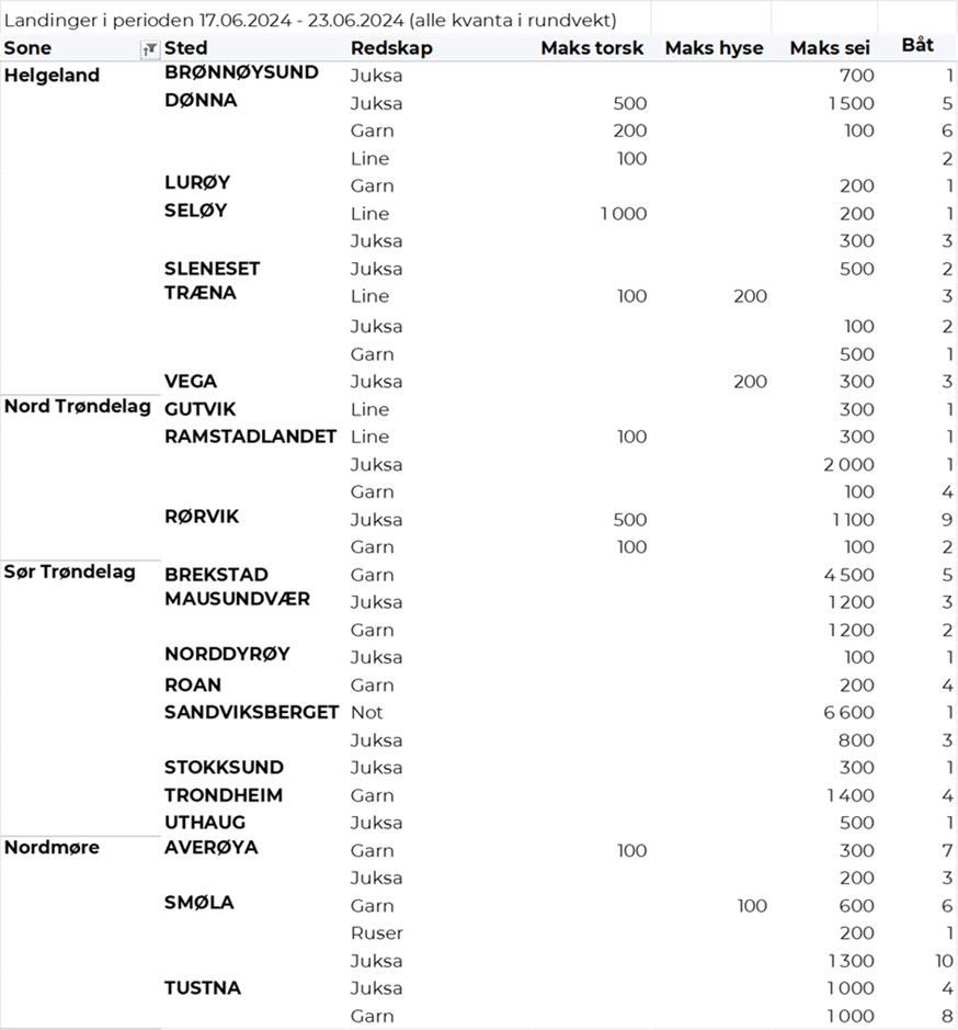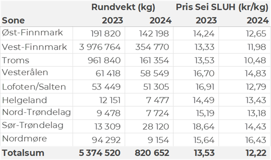 Omsetningen av fersk sei i uke 25 utgjorde 821 tonn til en verdi av 7,4 millioner kroner. En nedgang fra 840 tonn/ 7,3 millioner kroner uken før. Fangstene fordeler seg med 451 tonn tatt med snurrevad, 126 tonn tatt med not, 118 tonn på jukse og 111 tonn på garn. Størst aktivitet i Vest-Finnmark som står for 357 tonn av totalen, etterfulgt av Troms med 161 tonn, Øst-Finnmark med 140 tonn, Vesterålen med 58 tonn, 51 tonn i Lofoten og 28 tonn i Sør-Trøndelag. Kvanta under 8 tonn per sone for resterende.
