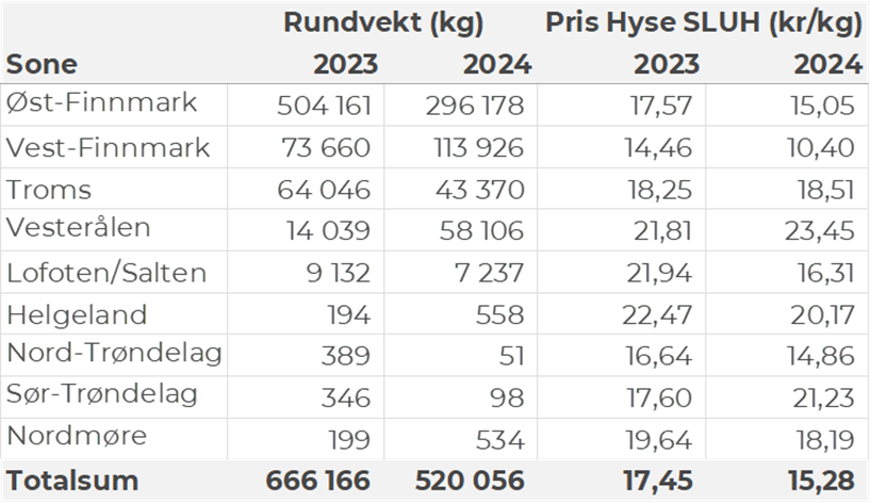 Kvantumet fersklevert hyse i uke 25 var 520 tonn til en verdi av 5,7 millioner kroner. En nedgang fra 963 tonn/ 9,9 millioner kroner uken før. Snurrevad står for 360 tonn av totalen, etterfulgt av 139 tonn fra line/autoline. Det meste leveres i Øst-Finnmark som står for 296 tonn av totalen, deretter følger Vest-Finnmark med 114 tonn, Vesterålen med 58 tonn og Troms med 43 tonn. Kvanta under 8 tonn per sone for resterende.