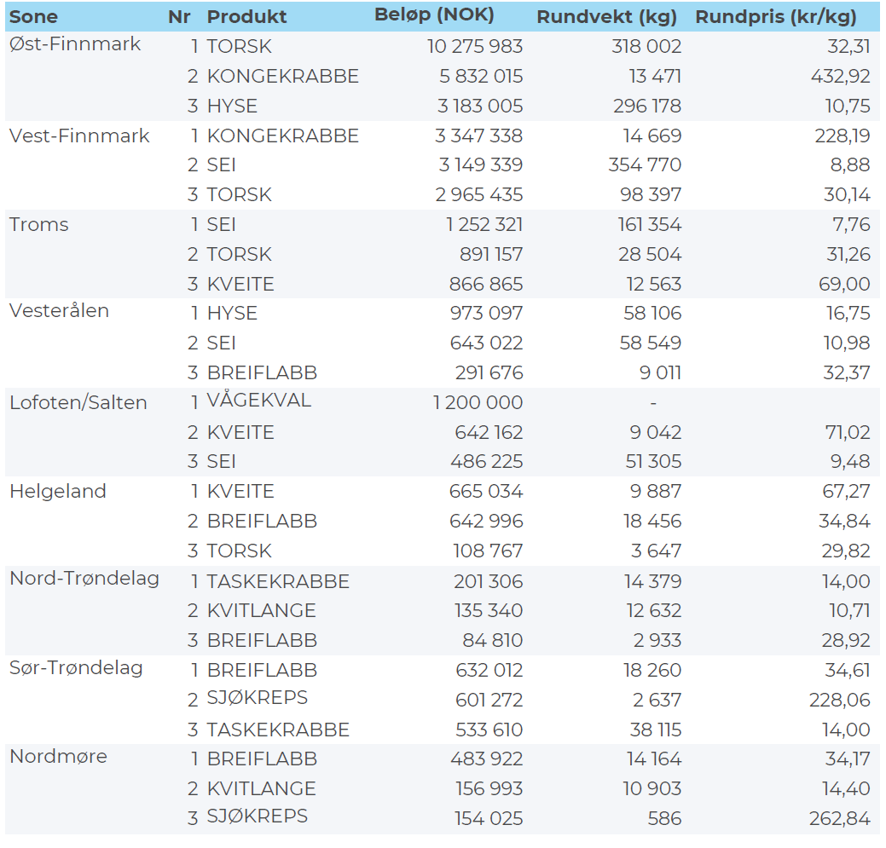 Hele 77 % av forrige ukes totale omsetningsverdi ble generert av villfanget sjømat som er fanget, fryst om bord og levert av havfiskeflåten. Leveranser fra kystfiskeflåten utgjorde 54 millioner kroner som er den laveste ukesverdien hittil i år. Til sammenligning ble det levert fisk og skalldyr fra denne flåtegruppen for hele 524 millioner i uke 10 - som til nå er årets toppuke. Samtidig viser tallene at mesteparten av kystfisket nå foregår i Finnmark, som er vanlig for denne årstiden.
