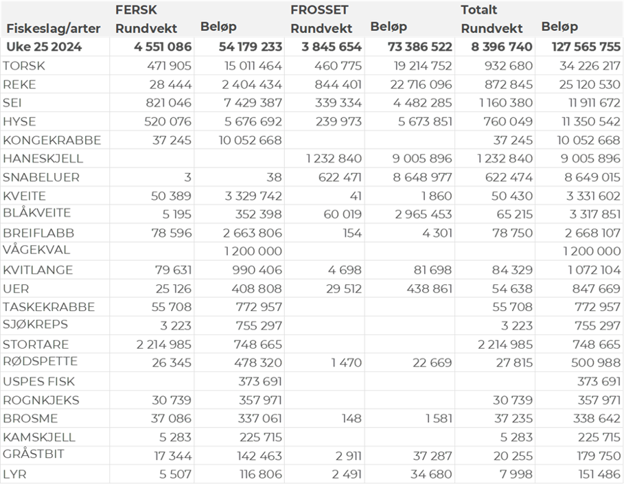 Omsetningen av ferskt råstoff i uke 25 utgjorde 54 millioner kroner, en nedgang fra 96 millioner kroner uken før. Fordelt per art er det torsken som ligger på topp med 15 millioner av totalen, etterfulgt av kongekrabbe til verdi 10 millioner og sei til verdi 7 millioner. Verdier fra 6 millioner og lavere per art for resterende, verdier for andre arter fremgår av tabell 1.