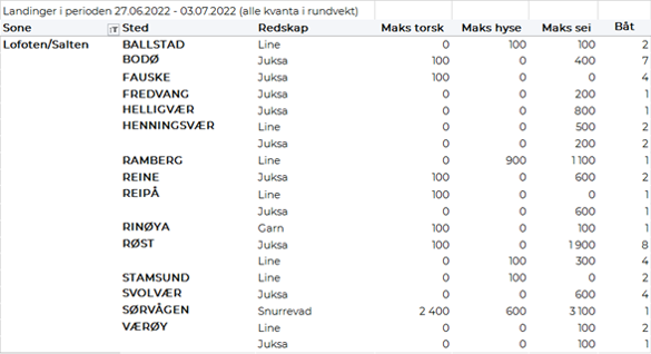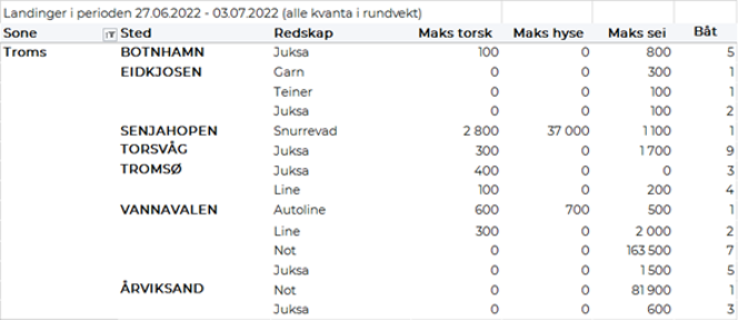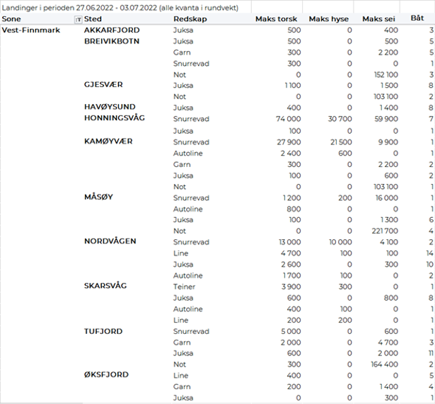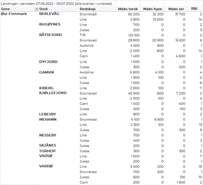 Omsetningen av fersk torsk økte til 1.440 tonn og verdi 33 millioner i uke 26, fra 1.280 tonn og 30 millioner kroner uka før. I uke 26 i fjor var et torskekvantum på 1.075 tonn levert fersk til verdi 17 millioner kroner. Fordelt per redskap er 870 tonn tatt på snurrevad, 260 tonn på line/autoline, 200 tonn på trål, 80 tonn på juksa og 30 tonn på garn. Størst snurrevadkvantum er levert i Vest-Finnmark med 480 tonn og Øst-Finnmark med 360 tonn. 220 tonn av linetorsken var levert i Øst-Finnmark og 40 tonn i Vest-Finnmark. Juksakvantumet var jevnt fordelt på Øst- og Vest-Finnmark med 30-40 tonn på hver. Trålkvantumet på 200 tonn var fordelt på 2 fangster levert Båtsfjord.