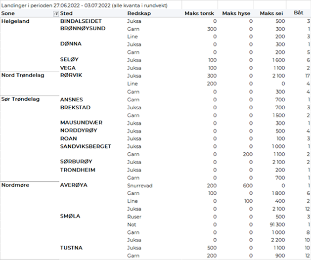 Omsetningen av fersk sei i uke 26 utgjorde 3.490 tonn/33 millioner kroner, opp fra 2.830 tonn/25 millioner kroner uken før. Det var størst aktivitet i Vest-Finnmark hvor det ble levert 2.100 tonn, hvorav 1.780 tonn på not, 230 tonn på snurrevad, 50 tonn på juksa og 40 tonn på garn. Deretter fulgte Troms med 950 tonn, hvorav 925 tonn på not. 180 tonn var levert på Nordmøre, av det var 140 tonn tatt på not. 130 tonn var omsatt i Øst-Finnmark, hvorav 100 tonn var tatt på snurrevad. Labert i øvrige områder. Totalt stod notfisket for nær 2.840 av de 3.490 tonnene fersk sei levert i uke 26, fulgt av snurrevad med 340 tonn, juksa med 190 tonn og garn med 100 tonn.